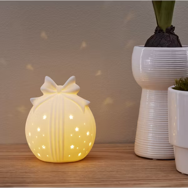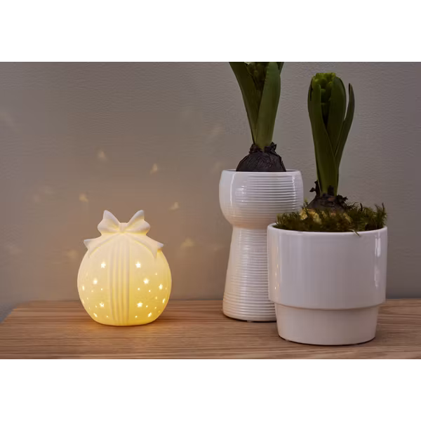 Fin bordsdekoration i vitt porslin. Drivs av 2xAAA batterier. Perfekt till julbordet och ger en mysig känsla i ditt hem.