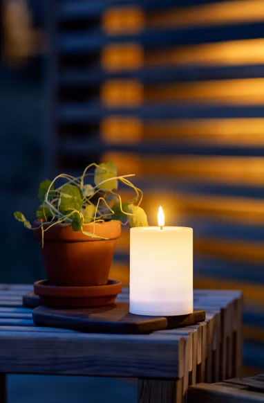 Solcellsljuset Flamme Saul är ett vitt plastljus som passar bra att lysa upp i en lykta eller som dekoration på till exempel en uteplats eller en balkong, den går också utmärkt att placera på en minnesplats där den lyser upp när mörkret faller. Med sin realistiska flamma lyser den upp med ett varmvitt sken. Detta ljus har en dold panel inuti plasthöljet och ska placeras så solen når ljuset under dagen för att uppnå den bästa laddningen till det medföljande batteriet.