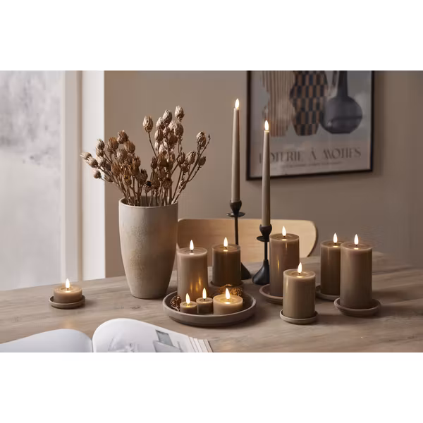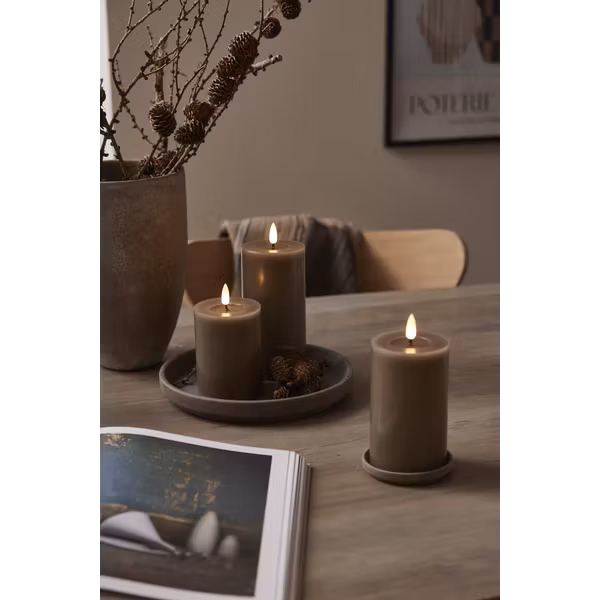 Flamme Flow är ett batteridrivet blockljus med vår naturtrogna låga Flamme med en brinntid på cirka 1500 timmar. Detta stearinljus har en blank nedsänkning under lågan, denna yta ser ut som flytande vax vilket gör ljuset än mer naturtroget. Ljuset är cirka 7,5cm i diameter och höjden 15cm för vax delen och cirka 17,5cm med lågan. Detta ledljus blir en vacker dekoration, både ensam och i grupp ihop med övriga ljus från vår Flamme serie. Den har timerfunktion och när brytaren är på timerläget lyser ljuset i ca 250 dagar med en vacker realistisk låga i varmvitt. Den drivs av 2 AA batterier, dessa ingår ej.