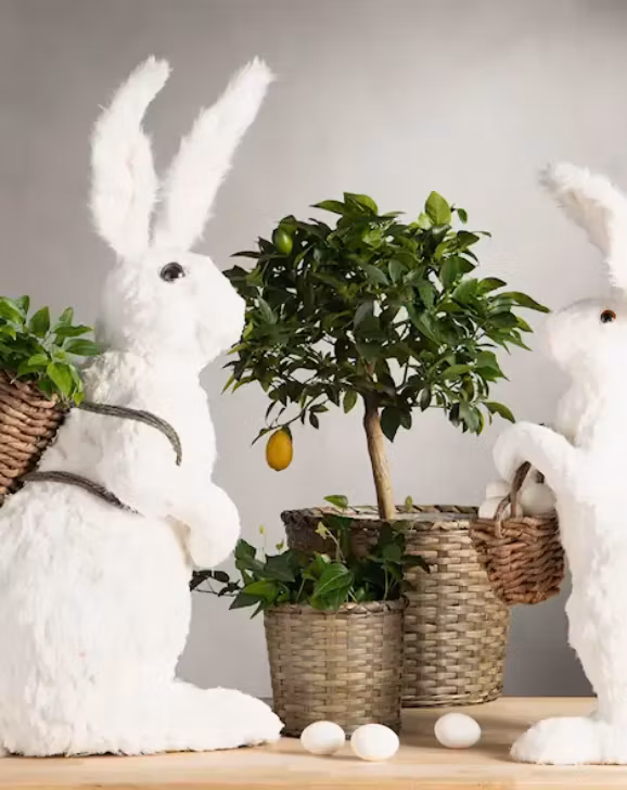 Sprid påskstämning med en stor kanin med ryggsäck. Tillverkad av frigolit, textil och rotting