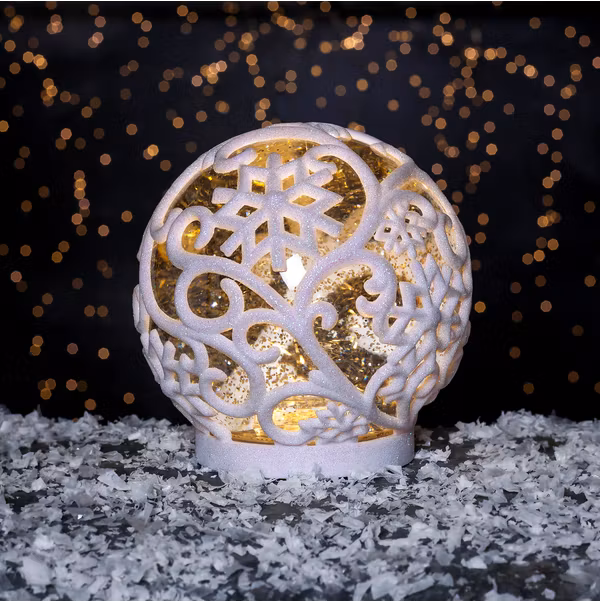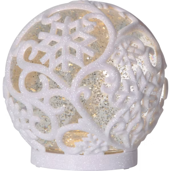 Batteridriven bordsdekoration med glittrande vätska. Inbyggd fläkt med motor ger en vacker dekoration med effekten av att det snöar inuti. Den inbyggda timern gör det lätt att ställa in när produkten ska lysa. Dekorera till jul och advent för den perfekta julkänslan.