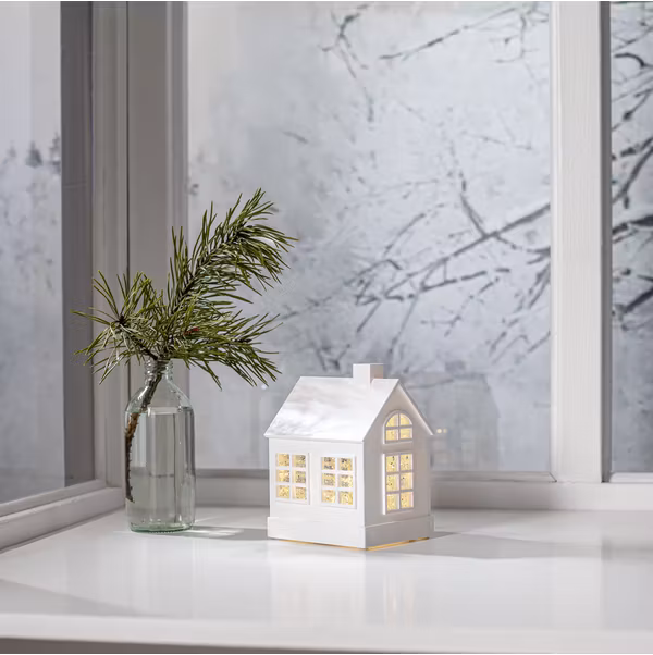 Fantastiskt vitt huslykta som juldekoration. Det snöar och lyser vackert när produkten är påslagen. Batteri driven med timer funktion. Placera på ett bord eller en hylla för en härlig advents och julstämning.