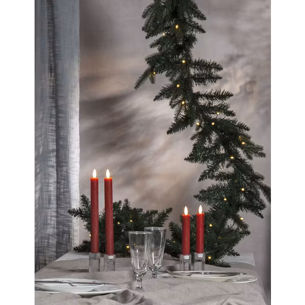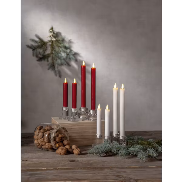 2p antikljus i mörkröd färg. Ljusen har en mycket naturtrogen låga som lyser med varmvitt sken. De har en inbyggd timer som gör det enkelt att bestämma när de ska lysa.