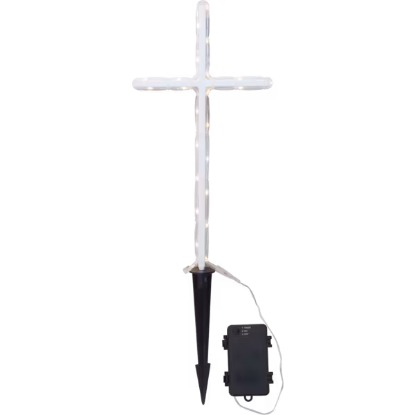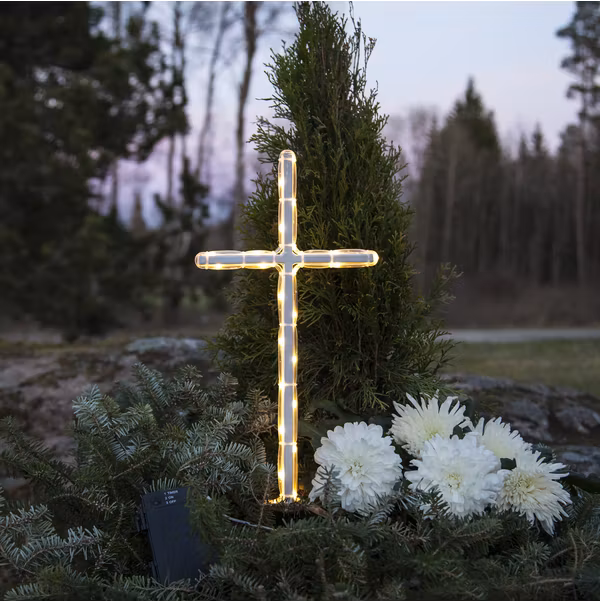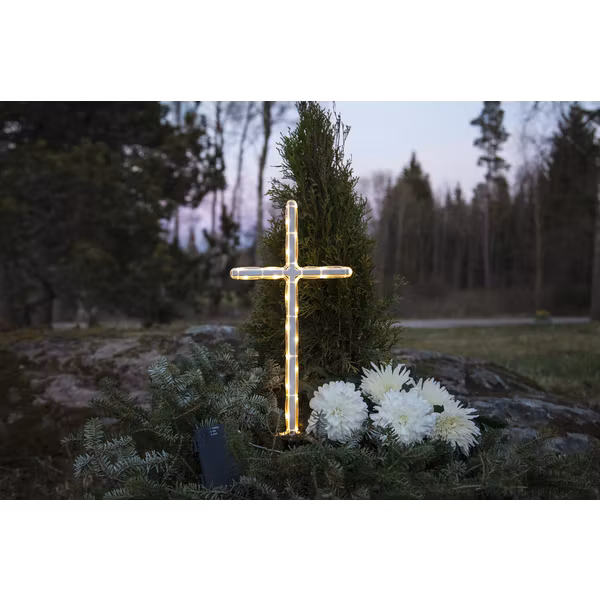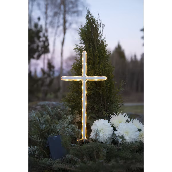 Vackert gravkors i ropelight med varmvitt sken. Korset är batteridrivet och den inbyggda timerfunktionen gör det lätt att ställa in när produkten ska lysa.