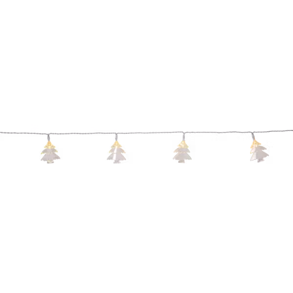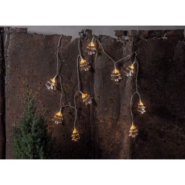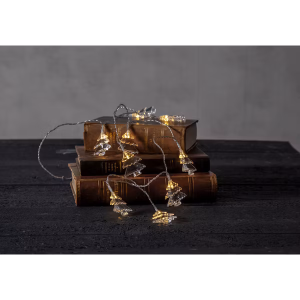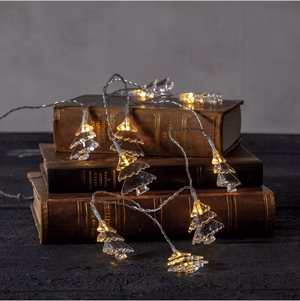 Batteridriven ljusslinga med transparenta dekorationer i form av julgran. Dekorativ inredning som ger ett mysigt sken i tex julgranen eller på bordet. Drivs med 2 st AA batterier (medföljer ej). För inomhusbruk