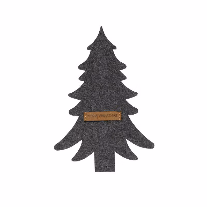 Bestickhållare tillverkad av filtmaterial i form av en gran och etikett gjord i konstskinn, är perfekt till julens fina dukningar. Tänk på att inte sätta besticken endast genom skinnetiketten!