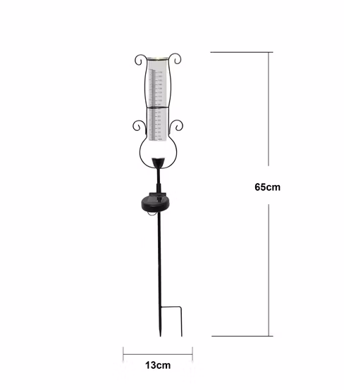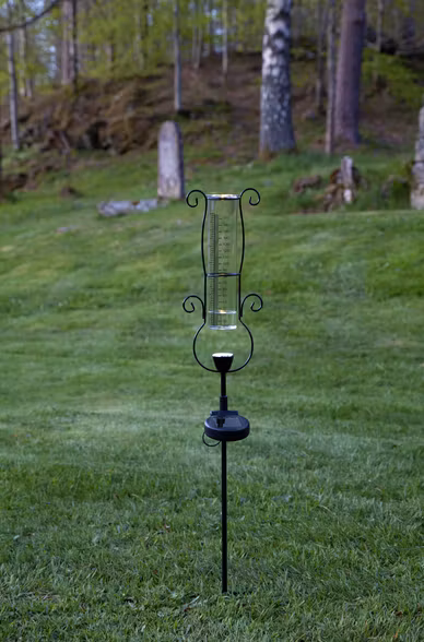 Regnmätare med millimeter och inch skala. Lyses upp i mörkret med varmvitt sken.