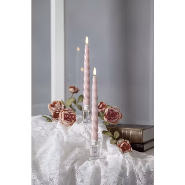 Flamme Shine är ett antikljus i 2 pack med vår naturtrogna låga Flamme. Detta stearinljus har en blank yta tillsammans med en svag tvistning som ger ett lyxigt utseende. Ljuset är cirka 25 cm hög. Detta ledljus blir en vacker dekoration, både ensam och i grupp ihop med övriga ljus från vår Flamme serie. Den har timerfunktion och när brytaren är på timerläget lyser ljuset i ca 30 dagar med en vacker realistisk låga i varmvitt. De drivs av 2x2 AAA batterier, dessa ingår ej. Dessa ljus har en silikonbelagd fot som gör att ljusen står stadigare i ljushållaren.