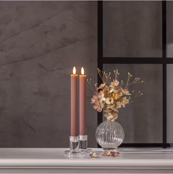 2 pack rosa antikljus i vår Flamme Stripe serie, gjorda i vax i med en räfflad-randig yta. Ljusen har en mycket naturtrogen låga som lyser med varmvitt sken. De har timerfunktion vilket gör att ljusen lyser i 6h per dag i ca 30 dagar. De drivs av 2 AAA batteri för varje ljus, dessa ingår ej. Dessa ljus har en silikonbelagd fot som gör att ljusen står stadigare i ljushållaren. Undvik att ställa ljusen i direkt solljus då de kan smälta och missfärgas av värmen. Storlek 2,1x25 cm.