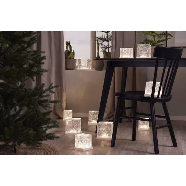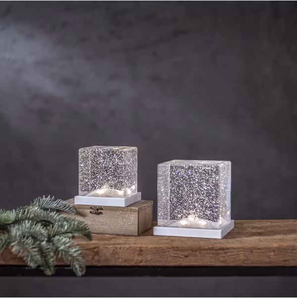 Batteridriven bordsdekoration med glittrande vätska. Inbyggd fläkt med motor ger en vacker dekoration med effekten av att det snöar inuti. Den inbyggda timern gör det lätt att ställa in när produkten ska lysa. Dekorera till jul och advent för den perfekta julkänslan. Placera iskuben i en hylla eller på ett bord och tänk på att inte placera den i direkt solljus.