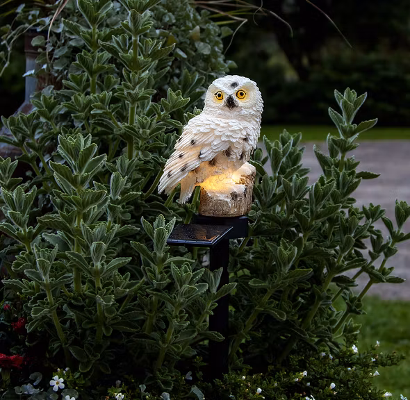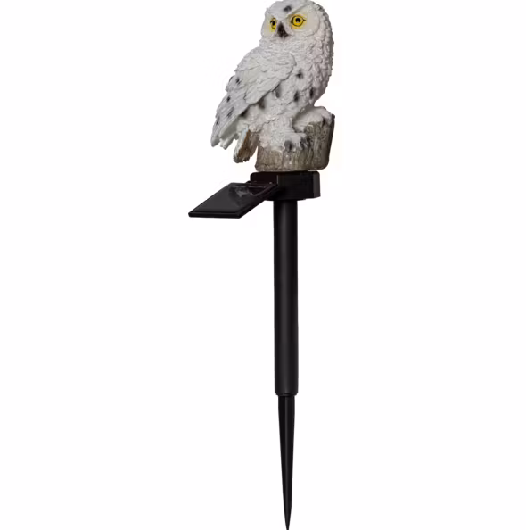 Vår vackra solcellsdrivna dekoration Owl lyser upp i mörkret med ett varmvitt sken. Denna solcellsbelysning är cirka 10x16cm för själva ugglan med bottenplatta och den sitter på en medföljande pinne som höjer upp den ytterligare 17cm. Denna solcellsdekoration är fin att dekorera med i trädgården eller på en balkong. Själva paneldelen går att vinkla så att solen lätt kommer åt att ladda batteriet som medföljer.